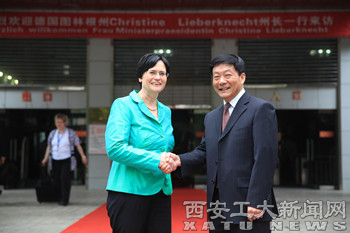 (本网讯)5月30日,德国图林根州州长克里斯蒂娜·李卜克内西女士率团到我校进行友好访问,校长廉振民、副校长刘卫国在金花校区亲切会见了来宾一行。