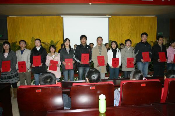 团委副书记、学生工作部副部长赵琼宣布了受表彰者名单,参会领导为受表彰同学颁发了证书和奖品。“十佳大学生”数理系王菲同学代表受表彰同学发了言,她鼓励广大同学把握大学期间的美好时光,全面提高自身素养,争取更大进步。随后,优良学风班代表建筑工程系050710班甘杰同学发言,分四个主题介绍了本班的基本情况和特色活动。