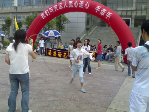 活动内容丰富多彩,第一个环节是“跳绳”,简单却别有一番意味。同学们单纯又真切的欢笑,仿佛回到了童年时光。意犹未尽中,各个代表队开始了紧张的第二环节“乒乓球接力”。老师们自成一组与代表队展开比赛。看大家认真的表情,似乎传递的不是小小的乒乓球,而是彼此的一份关爱、一份温情。第三环节开始之前,“心约”文艺部的同学们为大家献上了别具民族风情的“竹竿舞”。挥动的竹竿,伴着青春的节奏,跳出了和谐旋律。表演结束后,几位老师也上场,和同学一起跳起了“竹竿舞”,场上不时响起阵阵掌声。最后,四川灾区同学代表队荣获第一。