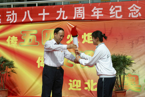 大会最后一项是师生共传五四文明之火,当党委书记赛云秀高高举起由同学们自制的象征文明之火的火炬时,会场响起了热烈的掌声。火炬在师生中传递,每到一处,都引起同学的阵阵欢呼。