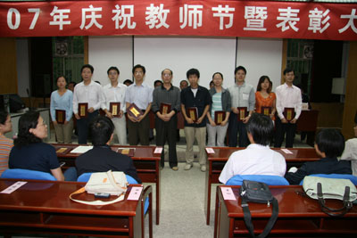 (本网讯)9月7日下午,我校隆重召开庆祝2007年教师节暨表彰大会。学校党政领导出席大会,各院系、各部门负责人及教师代表、受表彰的优秀教师、优秀教育工作者参会,大会由工会主席徐雪芹主持。