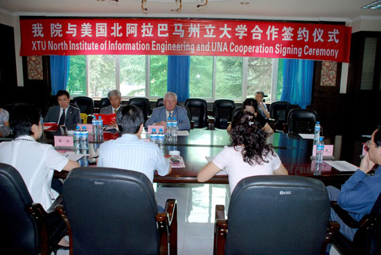 (本网讯)8月28日,美国北阿拉巴马州立大学校长William G. Cale,Jr校长访问【官网入口】星空体育登录页面,一键快速登录北方信息工程学院。北方信息工程学院董事长刘江南教授、副院长薛虹教授在金花校区与William G. Cale,Jr校长进行了亲切友好的会谈,双方就“2+2” 、“3+2”模式合作事宜充分交换了意见并达成了共识,签署了合作协议。