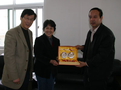 赛书记、刘校长代表学校接受李玉然校友为母校所赠精美礼品