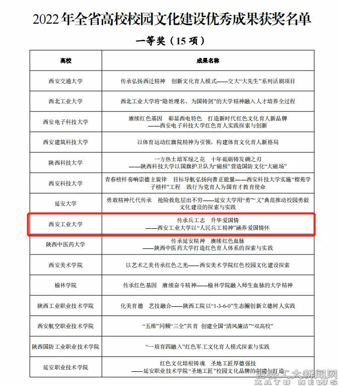 全省高校校园文化建设优秀成果评选由中共陕西省委教育工委组织实施,是陕西省高校校园文化建设成果的最高奖项。经专家评选、工委研究决定,今年共评出一等奖15项、二等奖20项和三等奖30项。