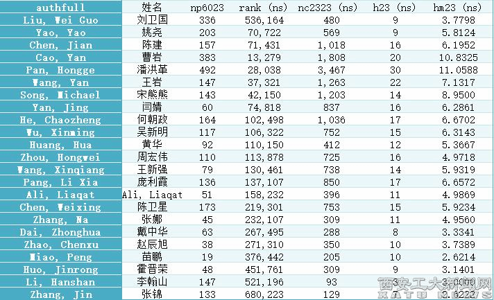 注:np6023:1960-2023年发文总量;rank (ns):他引排名;nc9623 (ns):1996-2023年他引次数;h23 (ns):2023年h指数(他引);hm23 (ns):2023年hm指数(他引)