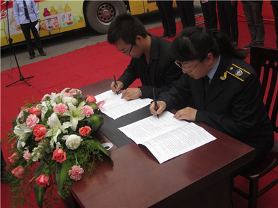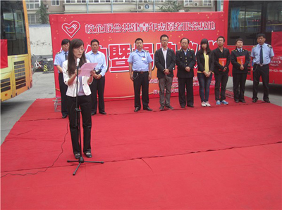 我校青年志愿者协会主席杨奔代表协会与公交六公司600路车队团支部签订了志愿服务协议,公交六公司党委副书记李延平与我校团委副书记张英为服务基地揭牌。公交六公司党委副书记梁纲、校团委副书记张英分别讲话,希望通过此次校企联合共建青年志愿者服务基地的形式加强双方之间的交流合作,不断弘扬“志愿、友爱、互助、进步”的志愿精神,增强青年服务社会的本领,让他们在服务社会中得到励炼,在服务社会中获得成长,让青春在社会课堂绽放光彩。