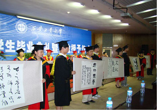 会上,艺术学院毕业生代表为光电学院高明教授等十位明星教师敬献了精心创作的书画作品,表达了对培养学生付出艰辛劳动的教师的感激之情。毕业生代表为主席台就座的领导敬献鲜花,向校领导和全体教辅人员表达了09届毕业学生的敬意之情。校领导也向学生代表回赠礼品留念。