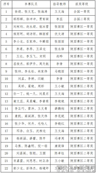 (本网讯)11月6日,2022年“高教社杯”全国大学生数学建模竞赛获奖名单公布。我校参赛队获得全国一等奖1项二等奖1项;陕西赛区一等奖8项,二等奖12项。