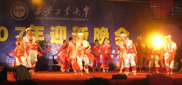 19:00整,晚会在极具陕西地方特色的安塞腰鼓中拉开帷幕,欢快的腰鼓让新同学感受到西安工大人的热情和豪迈。在整场晚会中,精彩节目让人目不暇接。大学生艺术团的同学们带来的歌伴舞《心中的日月》和相声《我的大学生活》让大家赞不绝口;雁塔校区田静同学的独舞《孔雀飞来》让大家感受了浓郁傣族的民族风情;经管学院同学们精心编排的桑巴舞《lucky》引起大家的阵阵欢呼;体育系和艺术学院5名同学带来的武术《醉拳》让在场的学生掌声呐喊声不断;汉文化研究社的同学们精心准备了汉服展示《如花似锦》,让大家在欣赏到精美的汉朝服装的同时,也领略到汉文化的魅力;由光电学院同学们演绎的小品《舍友》,讲述了一个在宿舍发生的感人故事,引起在场同学对大学生活的思考;艺术学院的同学们表演的《感恩的心》打动了在场的每一位学生,让大家学会感恩、学会面对人生的挫折;校学生会的同学们表演的西班牙舞《卡门》,以热情奔放的舞姿引起了同学们的阵阵欢呼。具有很强实力的逆时针乐队为大家奉献了自己创作的动听歌曲。