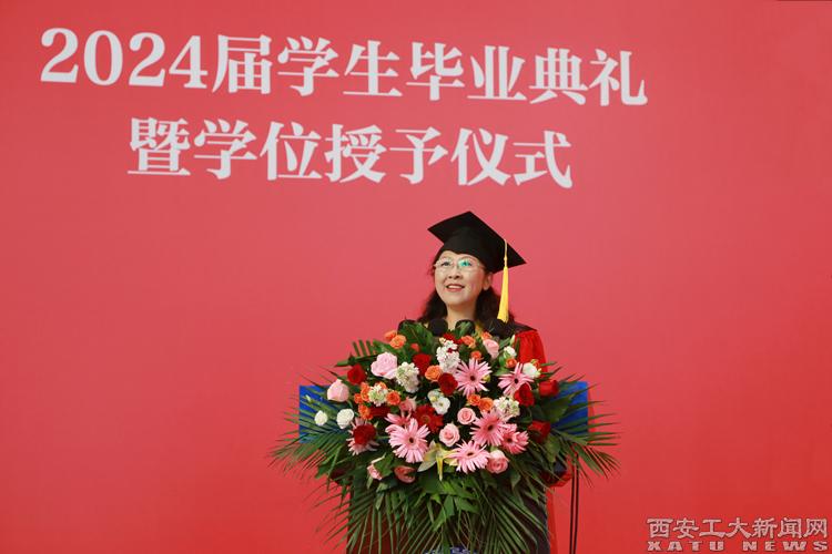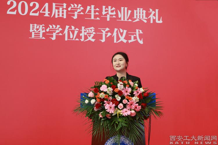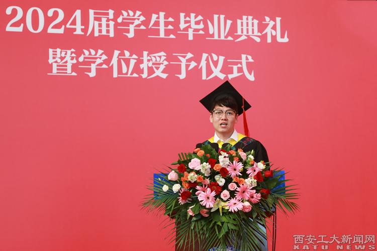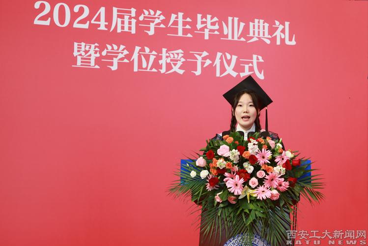 本科毕业生代表刘思佳同学发言。她讲道:“无论是在天之涯,地之角,我们都是西安工大人!未来或许一路花开,或许荆棘丛生,但最重要的是不忘初心,行以致远!明日之我,胸中有丘壑,立马振山河。”