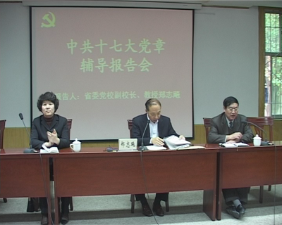 本次培训共分为三讲:党委委员、组织部长孙卫讲解了高校党支部的工作重点以及如何搞好党支部建设;组织部易超结合实际工作详细讲解了党员发展工作程序及应注意的问题;特邀省委党校副校长郑志飚教授做了十七大专题辅导。