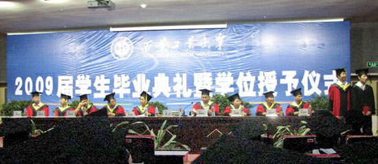 仪式上,李晋慧教授宣读了校长刘江南关于授予学位证书的委托书,李选民教授宣读了三好学生、优秀学生干部和校级优秀毕业生名单,杨力教授为09届优秀毕业生和受表彰学生拨穗并授予学位证书。