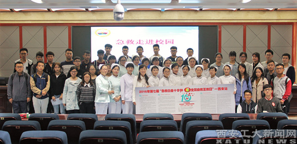 (本网讯)10月10日,全国第七届“急救白金十分钟——全国自救互救日”公益活动西安站在我校学术报告厅举办,邀请第四军医大学护理学院院长、西安护理学会急救专业委员会主任刘喜文教授为师生作《急救白金十分钟》专题讲座。第四军医大学护理学院、西京医院、西安市儿童医院、西安市红会医院、西安交通大学附属第一医院等医疗单位的急诊团队与我校团委、校医院工作人员以及两百余名师生共同参与了此次活动。