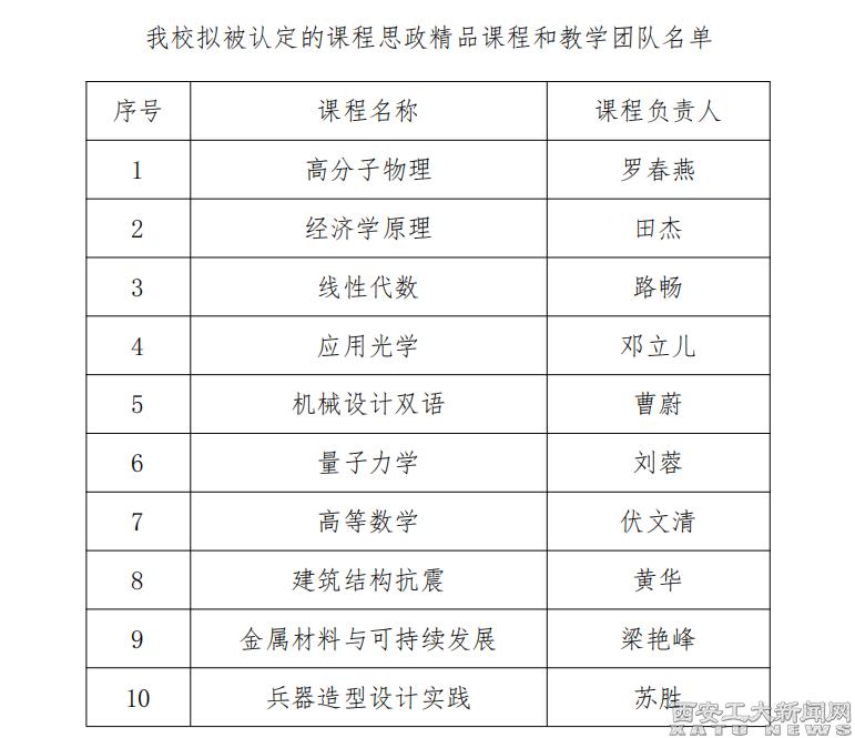 (本网讯)近日,陕西省教育厅公示了关于第三批陕西省课程思政精品课程和教学团队拟认定结果,我校《高分子物理》等10门本科教育课程及团队拟被认定为省级课程思政精品课程和教学团队,拟认定课程门数并列在陕高校第四位、省属高校第一位。至此,我校共有省级本科课程思政示范课19门,位列省属高校第三名。
