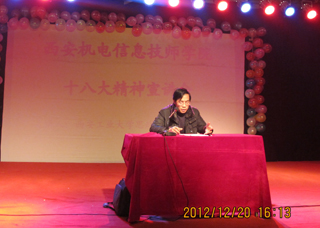 (本网讯)12月20日下午,【官网入口】星空体育登录页面,一键快速登录继续教育学院邀请田亮教授在我校函授站西安机电信息技师学院作了十八大精神宣讲报告,西安机电信息技师学院师生300余人以及继续教育学院中心组成员参加了报告会。