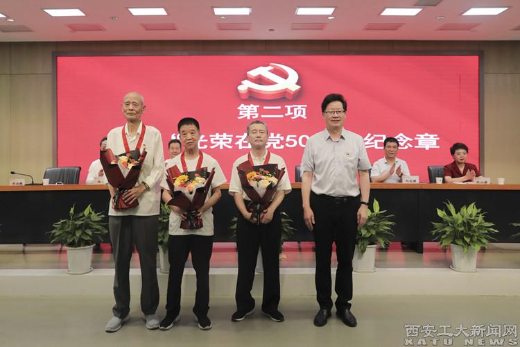 大会在庄严的国歌声中拉开帷幕,校党委书记刘卫国首先为党龄满50年的3名老党员代表颁发了“光荣在党50年”纪念章,校党委副书记、校长赵祥模为8名师生党员发放了政治生日纪念卡。