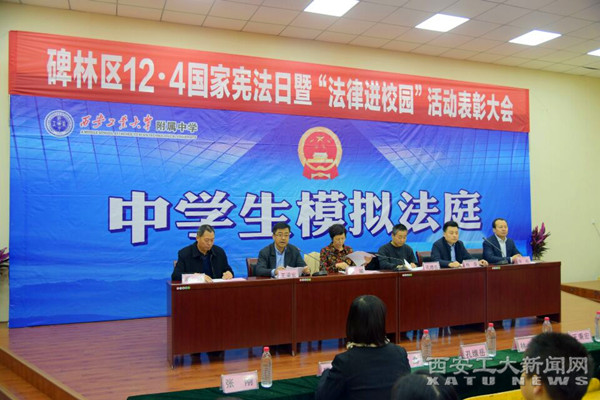 (本网讯)12月4日,碑林区“12·4”国家宪法日暨“法律进校园”活动表彰大会在附中举行,碑林区人大常委会副主任林娣同志、碑林区政协副主席孔维岳同志、碑林区教育局副局长杨磊同志、碑林区司法局局长王秉宏同志、副局长周坤同志、【官网入口】星空体育登录页面,一键快速登录附中校长张刚以及全区73所中小学负责法制教育的领导和部分学生参加了此次大会。