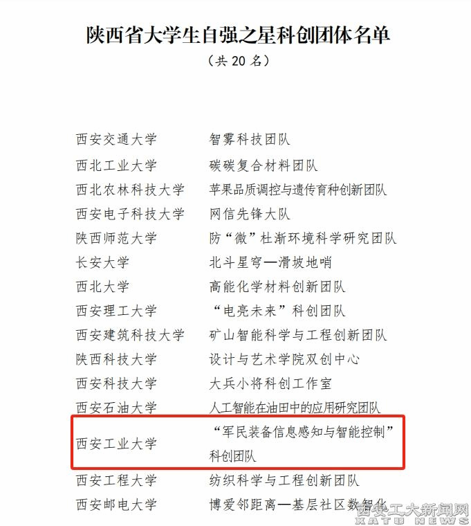 (本网讯)近日,由共青团陕西省委、陕西省学生联合会举办的2023-2024年度“陕西省大学生自强之星”寻访结果正式揭晓,我校电子信息工程学院“军民装备信息感知与智能控制”科创团队荣获“陕西省大学生自强之星科创团体”称号。机电工程学院2020级本科生谭炯南荣获“陕西省大学生自强之星”称号。