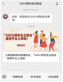 “XATU研究生云就业”智慧平台具备企业招聘岗位推送、学生简历内推、后台自定义推送就业信息、校园招聘管理、就业数据分析等功能,可实现“云信息”“云服务”“云招聘”“云指导”。