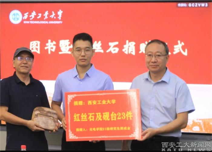 捐赠仪式上,校友总会办公室副主任周黎萍介绍了捐赠的基本情况。我校81级校友马龙向学校捐赠了图书1290册,总价达3万元。我校光电学院2021级研究生郎咸金同学及家人为学校捐赠了铭刻学校校风的红丝石1件,经加工雕刻的精美红丝砚22件,总价值达16万元。