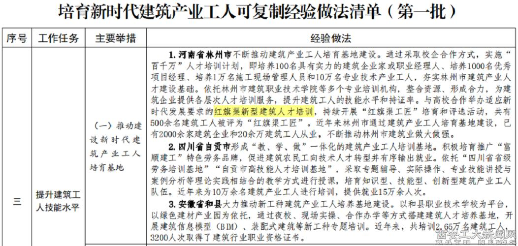 (本网讯)近日,住房城乡建设部印发培育新时代建筑产业工人可复制经验做法清单(第一批),我校建筑工程学院负责的“红旗渠新型建筑人才培训”经验做法,列入工作任务“提升建筑工人技能水平”的“推动建设新时代建筑产业工人培育基地”举措。