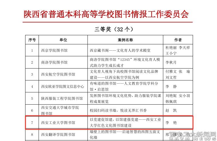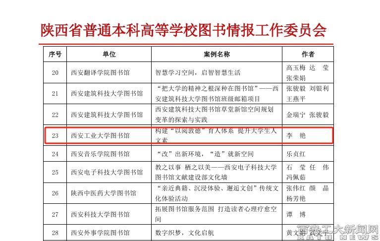 (本网讯)近日,由陕西高校图工委举办的“陕西高校图书馆环境文化建设案例征集与评选活动”揭晓,我校图书馆申报的两个案例《以党建促馆建,以馆建强党建——【官网入口】星空体育登录页面,一键快速登录红色文化图书馆建设》、《构建“以阅敦德”育人体系 提升大学生人文素养》均喜获三等奖。