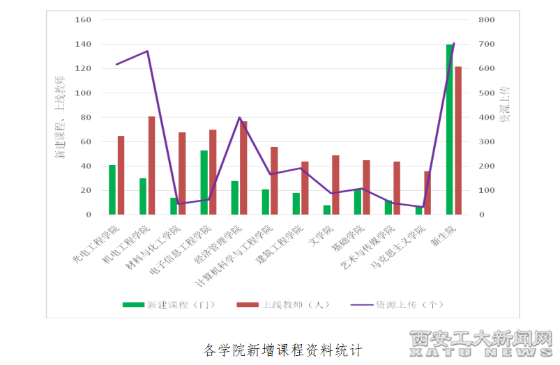 发掘数量适当、难度适中,能有效补充或拓展教材内容深度和广度的优质音/视频、参考文献、参考书、课件、讲稿等优质教学资源3248个,助力学生的自主学习。充分说明我校大部分任课教师已能较好掌握线上教学方法和发挥智慧教学工具的作用。图示的是各教学单位新建课程及资源上传情况。