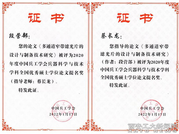 (本网讯)2022年1月17日,中国兵工学会公布了第五届兵器科学与技术学科全国优秀博士、硕士学位论文评选结果。我校硕士研究生段营部的硕士学位论文“多通道窄带滤光片的设计与制备技术研究”被评为2020年度中国兵工学会兵器科学与技术学科全国优秀硕士学位论文唯一提名奖,这是我校首次获此殊荣。