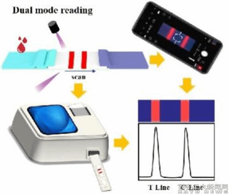为解决上述问题,该学生团队研发的荧光超敏即时检测平台,可靠的实现了临床样本超高精度和宽检测范围的检测,满足临床检测需求。该平台的使用操作简单,通过将血液样本滴加在试纸上,等待数分钟后,使用小型紫外灯和智能手机拍照即可实现“定性”读取,也可将试纸放入读取装置,实现自动“定量”读取。