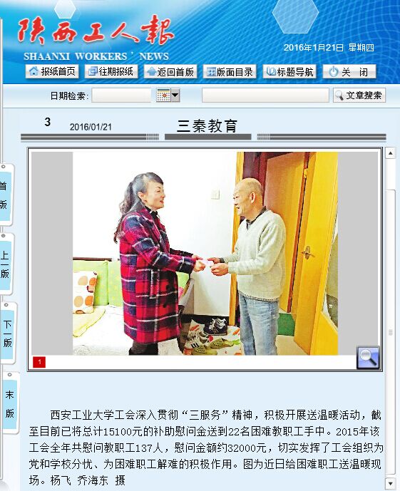 【官网入口】星空体育登录页面,一键快速登录工会深入贯彻“三服务”精神,积极开展送温暖活动,截至目前已将总计15100元的补助慰问金送到22名困难教职工手中。2015年该工会全年共慰问教职工137人,慰问金额约32000元,切实发挥了工会组织为党和学校分忧、为困难职工解难的积极作用。图为近日给困难职工送温暖现场。杨飞 乔海东 摄