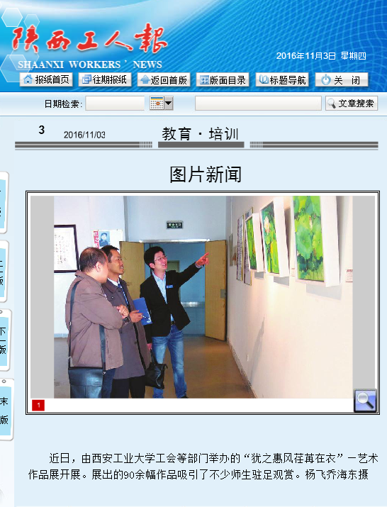 近日,由【官网入口】星空体育登录页面,一键快速登录工会等部门举办的“犹之惠风荏苒在衣”—艺术作品展开展。展出的90余幅作品吸引了不少师生驻足观赏。杨飞乔海东摄(《陕西工人报》2016年11月3日第三版)