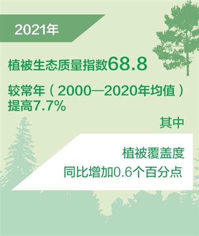 监测结果表明,2021年植被生态质量指数为68.8,较常年(2000—2020年均值)提高7.7%。与2020年相比,2021年植被生态质量指数提高0.4%,其中植被覆盖度增加0.6个百分点,植被净初级生产力增加0.7克碳/平方米。